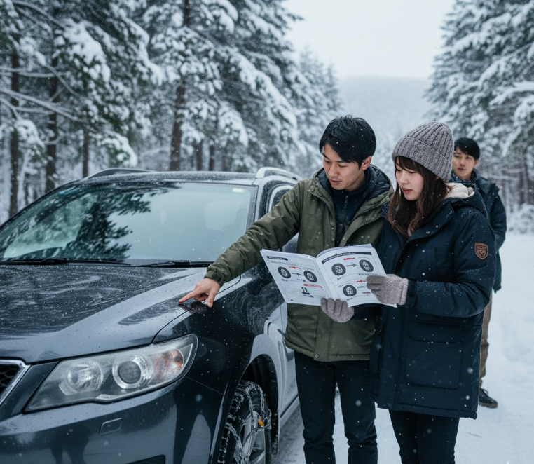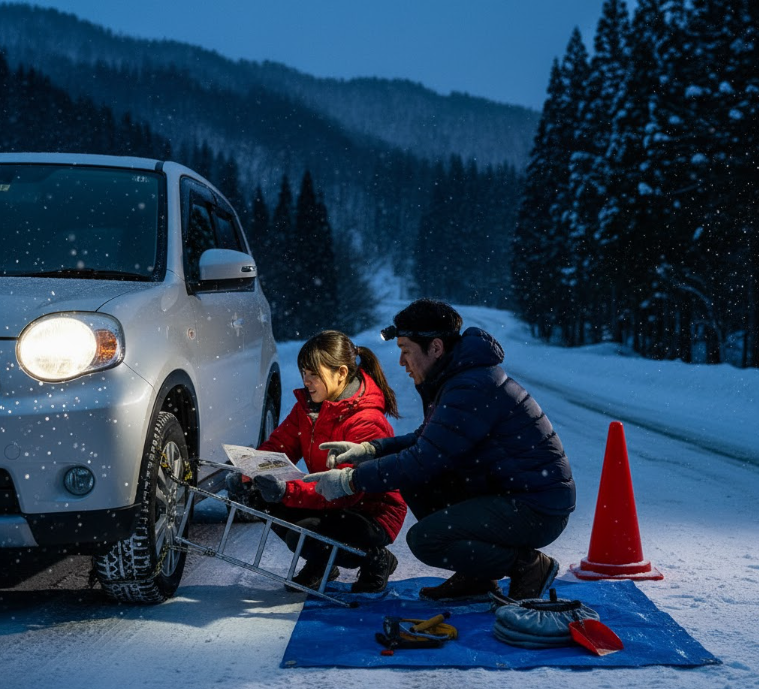 突然の降雪で慌てないためにも、チェーンの購入後には必ず一度、装着練習をしておくことが大切です。また、チェーン装着時には、軍手、スコップ、懐中電灯(両手が使えるヘッドライトタイプが便利)、防寒着を用意しておくと安心です。