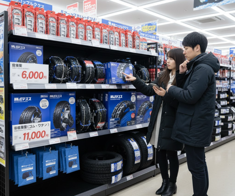 ディスカウントストア(ドン・キホーテなど)も、店舗によってはチェーンを扱っています。しかし、こちらも在庫が限られており、雪が降るとすぐに売り切れてしまう可能性が高いため、過度な期待はできません。