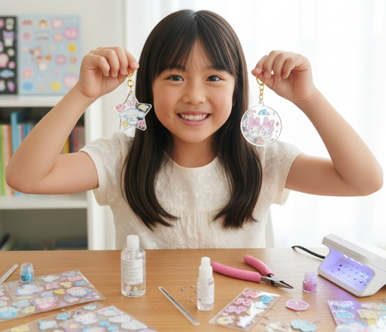 100円ショップなどで手に入る透明なアクリルキーホルダーのパーツにシールを貼ったり、レジン液でコーティングしたりすることで、本格的なチャームが出来上がります。
