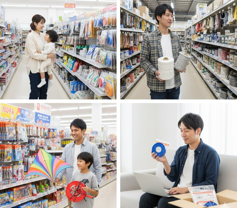 • 凧揚げ・工作用は「100均(手芸)」「ホムセン(DIY・資材)」「おもちゃ屋」。