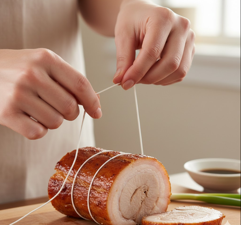 ちなみに、チャーシューを糸で巻く目的は、専門的な結び方で縛ることではなく、「肉の形を均一にして、火の通りを均等にする」ことです。